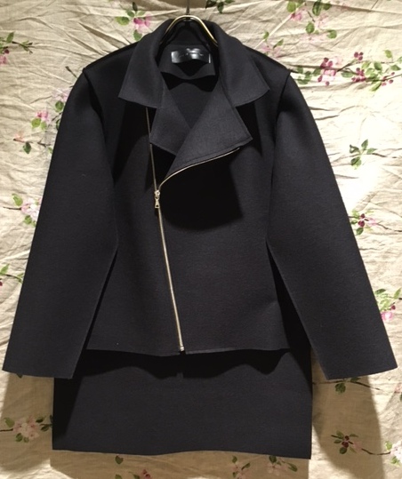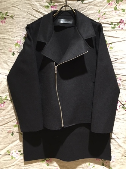 こちらもお奨めのバイカーズコート。前から見るとショート丈のいつものライダースで、なんと後ろはミディアム丈